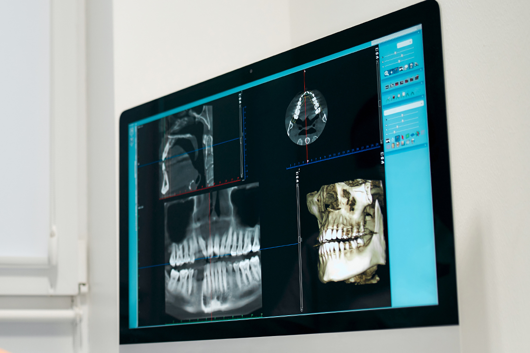 インプラント治療は、噛む機能の回復はもちろん、見た目の自然さも重視した治療です。そのため、インプラントを理想的な位置・角度・深さに正確に埋入することが非常に重要となります。当院では、歯科用CTで顎の骨の状態を詳細に把握し、専用のシュミレーションソフトを使って治療計画を立てます。骨の厚みや高さが不足している場合には、事前に骨造成が必要かどうかも判断することが可能です。こうした綿密な準備により、インプラント治療の安全性と確実性を高めています。また、作成したシミュレーションは、モニターを通して患者様にもご覧いただきながら、丁寧にご説明いたします。治療内容をご理解いただいたうえで手術に臨んでいただけるため、安心して治療を受けていただけます。